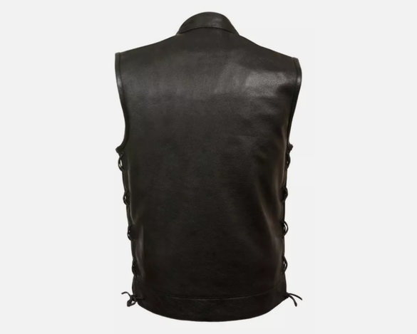 Fits Universal Fit for Men's Motorcycle Riding. This MILWAUKEE Men's SOA Leather Vest features a snap and zipper front closure, side laces for adjustable fit, and two concealed gun pockets. Crafted from durable leather, it offers both style and practicality for riders. New Old Stock: Packaging May Vary, Listing is for a Quantity of 1 Unless Specified in the Title
